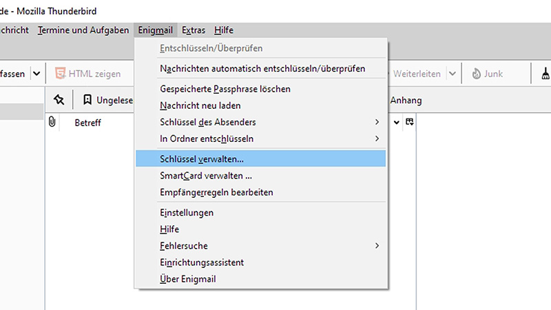 Update 15. September 2020: Die Erweiterung Enigmail ist ab Thunderbird 78.2.2 (32-Bit) nicht mehr notwendig. Hilfreich ist diese Anleitung von Mozilla. - Um ein Schlüsselpaar zu erzeugen gehen Sie in Thunderbird auf den Punkt Enigmail > Schlüssel verwalten…