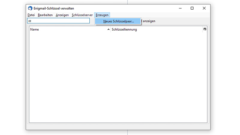 6. Im Fenster Enigmail-Schlüssel verwalten klicken Sie auf Erzeugen und Neues Schlüsselpaar…