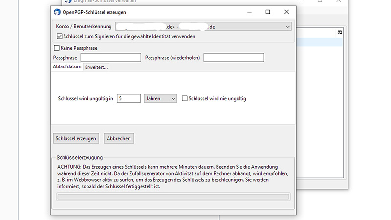 7. Im folgenden Fenster OpenPGP-Schlüssel erzeugen wählen Sie zuerst oben das Konto/die E-Mail Adresse aus, für die das Schlüsselpaar erzeugt werden soll. In den Feldern darunter geben Sie als Passphrase ein Kennwort zur Absicherung Ihres privaten Schlüssels (mit dem Sie die Mails an Sie selbst entschlüsseln) ein, damit diesen niemand ohne weiteres verwenden kann. Dann auf Schlüssel erzeugen klicken.