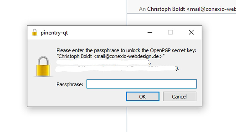 Wenn Sie dann auf Entschlüsseln klicken erscheint ein kleines Fenster mit der Abfrage der Passphrase, die Sie zur Absicherung Ihres privaten Schlüssels bei dessen Erzeugung eingegeben haben.